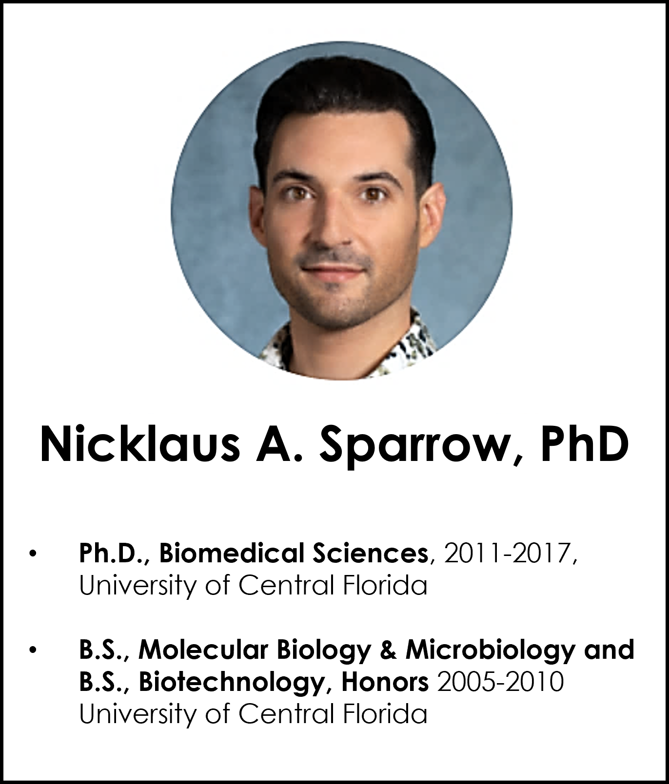 Dr. Sparrow holds a PhD in Biomedical Sciences with a focus in Neurobiology, and has been a molecular reserach scientist for over 12 years with experience in histology, advanced molecular imaging, digital tissue analysis, and laboratory operations. He has authored peer-reviewed neuroscience primary publications, and has presented at national and international scientific conferences focused on research within the nervous system. Most recently, he served as laboratory manager of a translational neuroscience research laboratory in the Neurology Department at Cedars-Sinai Medical Center, where he helped found, establish, and build the lab.