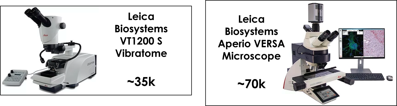 To launch operations, we need two pieces of principal equipment: a Leica Biosystems VT1200 S vibratome for reproducible brain sectioning and a Leica Biosystems Aperio VERSA epifluorescence microscope for multichannel imaging. Additional financial support is needed to fund laboratory space, utilities, compliance, materials, digital infrastructure, educational content, and a modest strategic reserve. Together, these resources will enable Lambda to begin providing free scientific services while building the open-access and educational programs central to its mission.