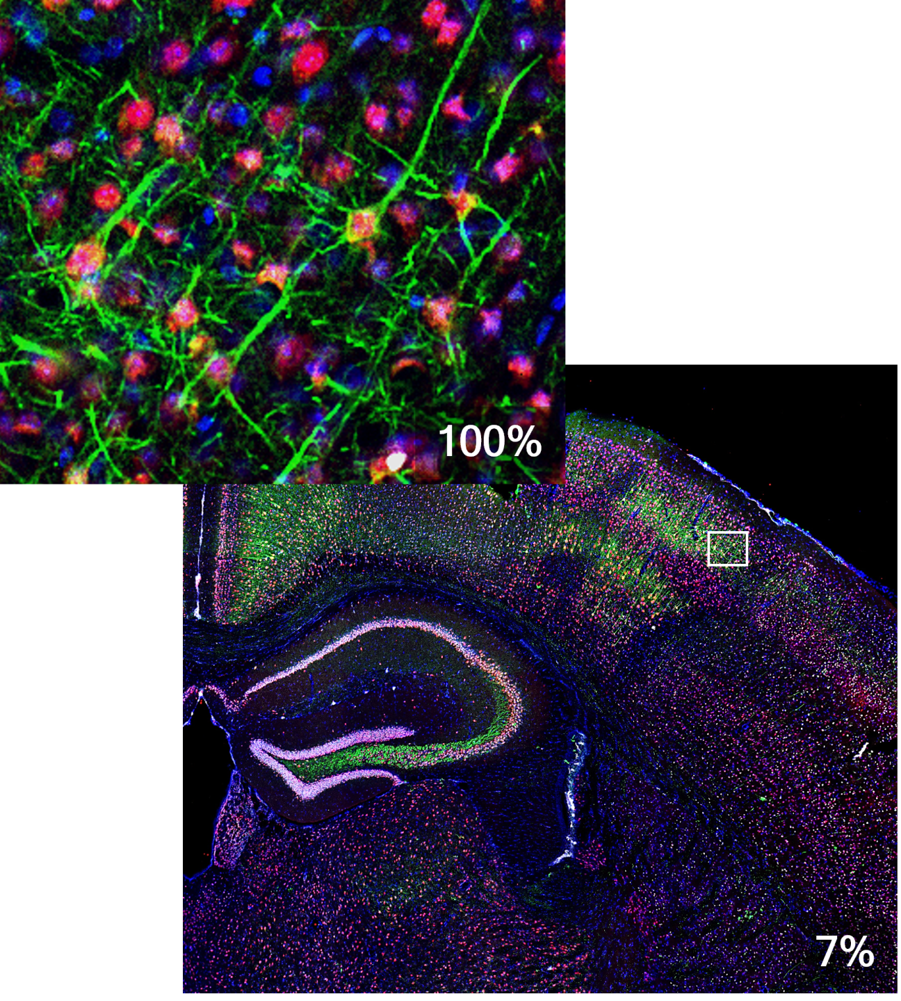 Histology (microscopic analysis of biological tissue) is one of the principal ways scientists study how disease alters the brain as it allows visualization of molecular changes at the single cell level. Yet in many conventional workflows, analysis is limited to selected regions of the brain and relatively few imaging channels, which constrains how much information can be extracted from a given specimen. Lambda’s model is intentionally designed to expand both the scale and the detail of tissue visualization (for example, see images labeled A and B for more detail). By combining broader brain coverage with higher-dimensional imaging, the foundation aims to help researchers identify new disease mechanisms and ultimately new potential therapies.