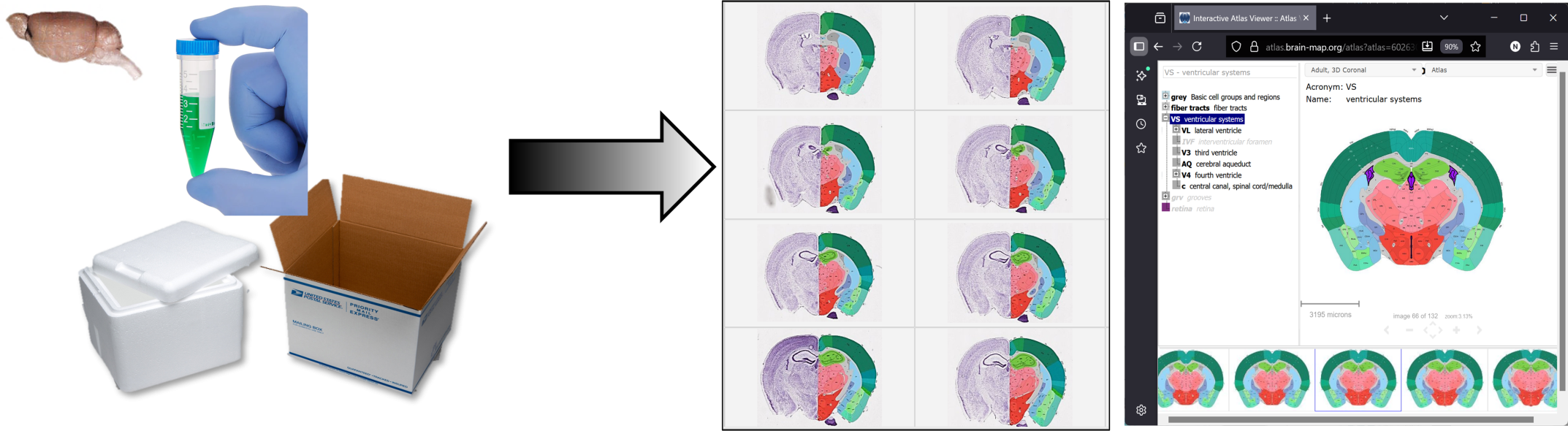 Lambda operates as a free, specialized, and outsource histology service for neuroscience laboratories. Researchers conduct their experiments and generate brain tissue samples within their laboratories and send these samples to Lambda, similar to the process of medical doctors sending in patient biopsies for lab analysis. Lambda performs the downstream sample processing needed to transform tissue into rigorous, highly granular digital image datasets. The goal is to provide researchers with a more comprehensive and information-rich view of brain tissue, that is standardized across many brain disease models, while reducing the technical and financial burden placed on individual laboratories. These digtials images are indexed and are available to reserachers through our database website.